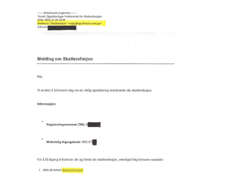 Nasi klienci alarmują o mailach będących próbą wyłudzenia. Na pierwszy rzut oka wiadomość wygląda na wysłaną z Norweskiego Urzędu Skarbowego Skatteetaten. W rzeczywistości jednak są wysyłane z adresu mailowego nie mającego nic wspólnego z norweską skarbówką. W mailu zatytułowanym „Oppdateringer Vedrørende Din Skattesituasjon” (pisownia oryginalna) znajduje się fałszywa informacja sugerująca, że chodzi o zwrot podatku – skatterefusjon. Podany jest tam kod transakcji oraz tymczasowy kod dostępu.