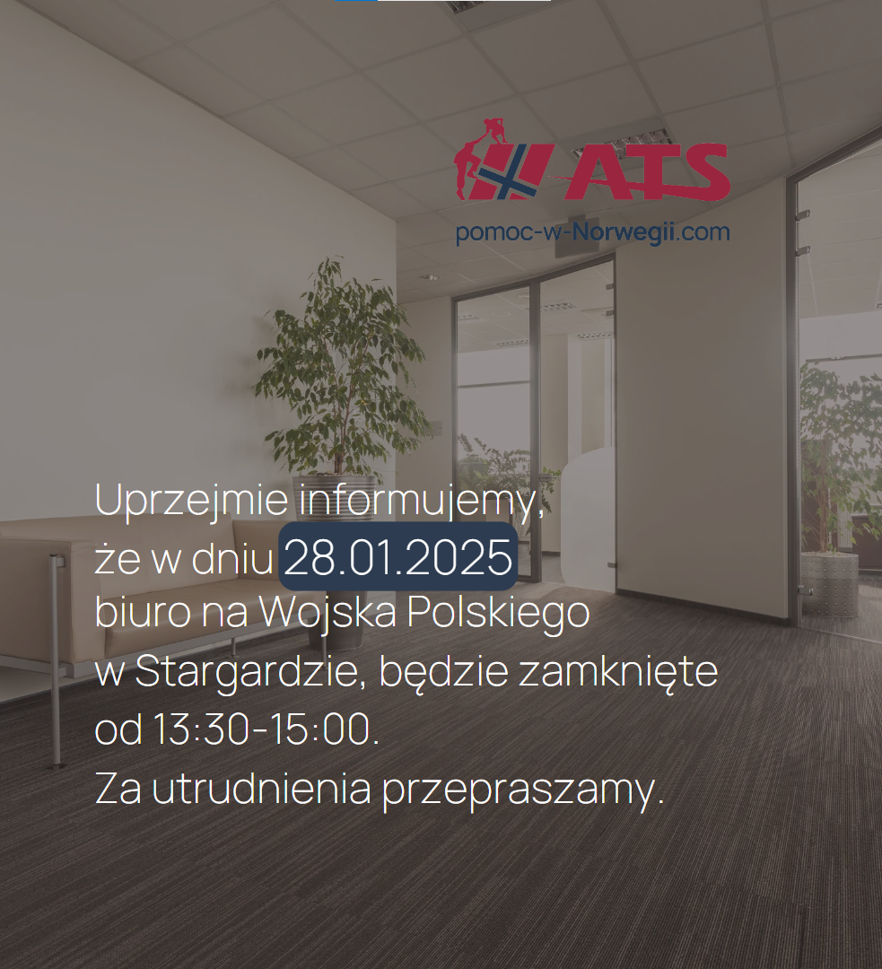 We wtorek, 28 stycznia, nasze biuro mieszczące się przy ulicy Wojska Polskiego w Stargardzie będzie zamknięte miedzy godziną 13.30 i 15.00.