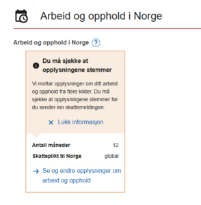W tegorocznym skattemelding niektórzy pracownicy zagraniczni muszą wypełnić rubrykę dotyczącą długości pobytu i pracy w Norwegii. Pytanie pojawia się po to, żeby ustalić, ile dni faktycznie przebywałeś i pracowałeś w tym kraju. Ma to wpływ na część odliczeń – im dłuższy pobyt, tym większy jest na przykład minstefradrag.