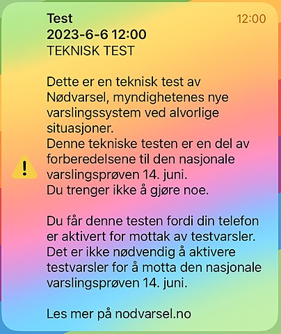 12 czerwca w samo południe telefony komórkowe w Norwegii zawibrują i powiadomią dźwiękiem, że dzieje się coś niezwykłego. Tym razem to tylko test. Policja wyśle zawiadomienie kryzysowe tylko jako sprawdzenie, czy system ostrzegania kryzysowego działa, jak należy. Podczas ostatniej próby przeprowadzonej w zeszłym roku nie wszystkie telefony zareagowały właściwie na powiadomienie, szczególe starsze modele odmawiały współpracy. Szacuje się, że 25% posiadanych w Norwegii telefonów nie będących w stanie obsługiwać powiadomień alarmowych.