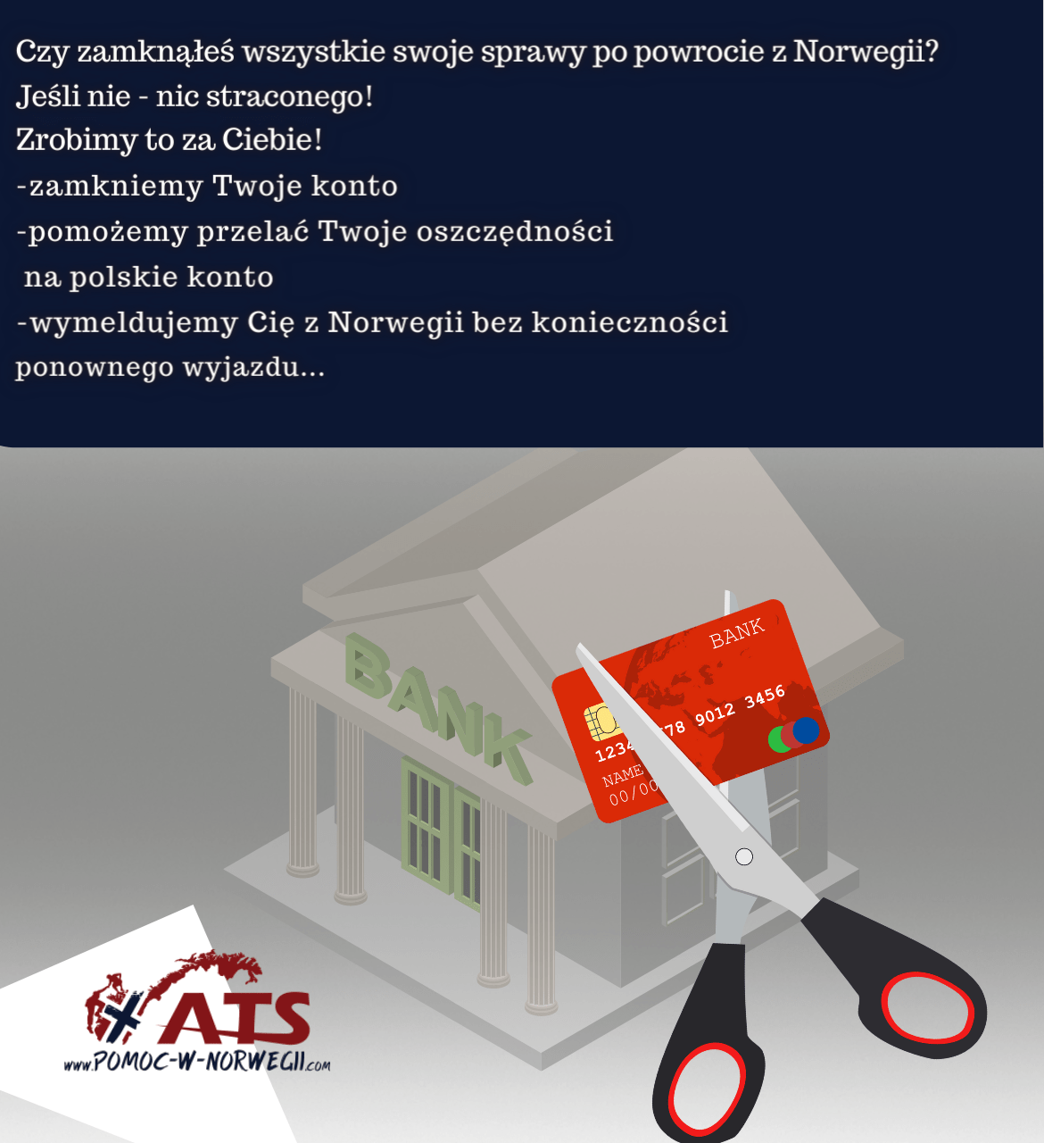 ATS Pomoc w Norwegii pomaga klientom dopełnić formalności związane z zamknięciem konta w Norwegii. Wyprowadzasz się do Polski i chcesz zamknąć swoje norweskie konto? Zgłoś się do nas, pomożemy ci przejść przez procedury i doradzimy najlepsze rozwiązanie.